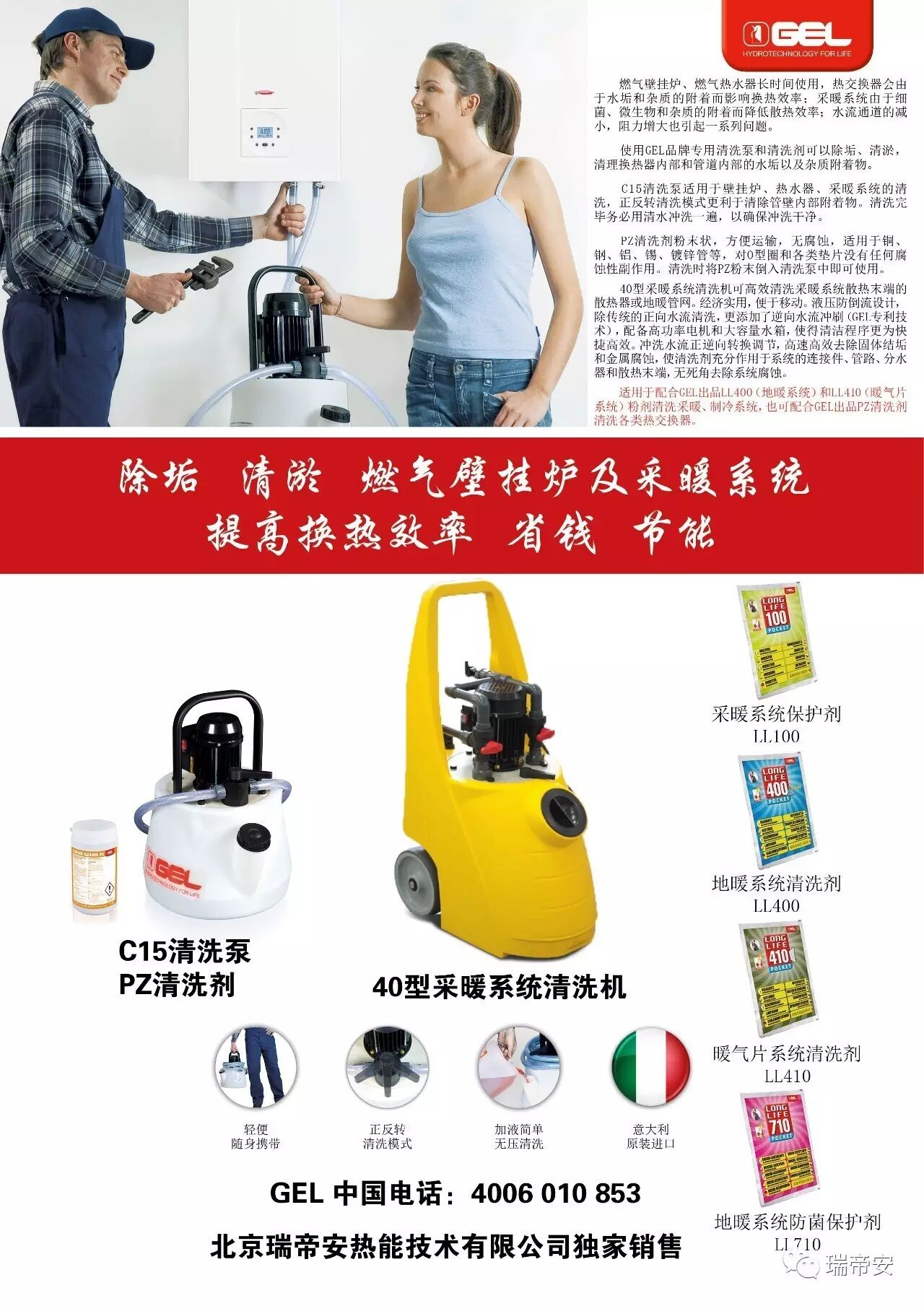 2016年北京瑞帝安热能技术有限公司引进意大利GEL品牌清洗设备和各类清洗剂和保护剂,为供暖设备(壁挂炉、空气能、热水器、太阳能等)和末端(地暖、暖气片)提供专业的清洗和系统维护。